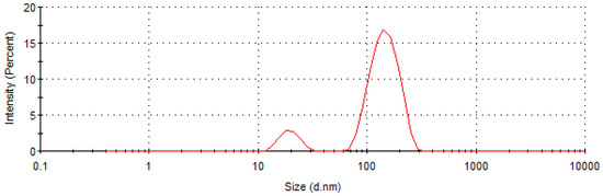The results advocated that poly-6-MOEG-9-T-BF3k-FE was inclined to produce water-soluble nanoparticles showing dimensions around 166 nm in agreement with the results obtained with parent PPBFB derivative poly-6-MOEG-9-TM-BF3k samples [24,25]. In particular, poly-6-MOEG-9-T-BF3k-FE derivative generated in water two homogeneous populations (Figure 11), which, on the bases of the apparent dimensions, were assumed to be isolated macromolecules (diameter around 20 nm) and supra-macromolecular aggregates (diameter around 150 nm).