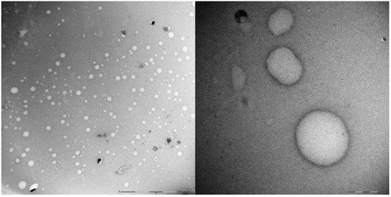 The self-aggregating features of poly-6-MOEG-9-T-BF3k-FE were substantiated by the results of TEM analysis. In particular, a sample (~2 mg) of the polymer was treated with water (0.5 mL) at room temperature in static conditions to produce the swelling of the polymer in few minutes to form a transparent hydrogel, which was expanded by the progressive swelling up the formation of an opalescent dispersion after 1 h. After equilibration at room temperature for two weeks, the nearly transparent dispersion was analyzed by transmission electron microscopy (TEM) with negative staining with uranyl acetate. The analysis of TEM images suggested the propensity of poly-6-MOEG-9-T-BF3k-FE to generate spherical objects showing dimensions in the range of 20–200 nm (Figure 12) in agreement with the assumption that isolated macromolecules (~20 nm) were liable to self-assemble into supramolecular entities showing greater dimensions.