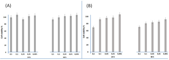 Cell viability % (tetrazolium salt (MTS) assay) of poly-6-MOEG-9-T-BF3k-FE on human colon cancer cells HCT116 (panel A) and normal human bronchial epithelial cells 16HBE (panel B) cells, after 24 h and 48 h of incubation at concentrations of 0.005, 0.01, 0.03, 0.1 and 0.5 mg/mL.