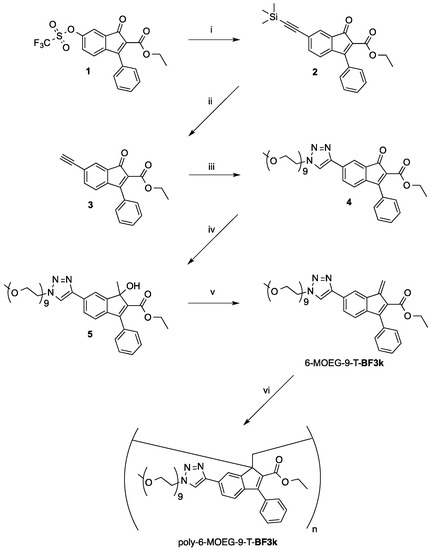 “Grafting through” approach to PPBFB derivative poly-6-MOEG-9-T-BF3k. Reagents: (i) ethynyltrimethylsilane, CuI, Pd(PPh3)2Cl2, TBAI, TEA, DMF; (ii) C2H5ONa, C2H5OH; (iii) CH3(OCH2CH2)9N3, CuBr, DIPEA, THF; (iv) Al(CH3)3, CH2Cl2; (v) Procedure A: PTSA, TFA, CDCl3; Procedure B: PTSA, CD3CN; (vi) solvent elimination (for the details see the Materials and Methods section).