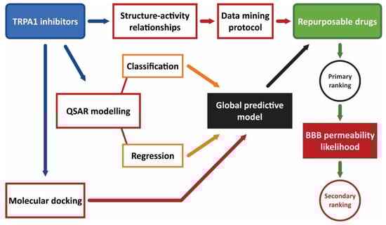 Novel drug design is a timely effort of multidisciplinary teams that requires vast amounts of allocated human and material resources with a relative chance of failure. A growing preoccupation has been observed worldwide for promising, less expensive routes of drug discovery. Drug repurposing implies the exploration of new potential biological targets for molecules already approved by national drug agencies or in late stages of development as a means to speed up the process of identifying new candidates for treating diseases of high interest [45,46]. Computer-aided drug design and discovery methods have been continuously improved over the past years, working to reduce costs and time investments for the identification and optimization of new lead molecules, but also as drug repurposing tools [47,48,49]. Considering the attractiveness of such strategies for discovering novel therapeutic solutions using repurposable drug candidates [50], we performed in silico screening studies based on chemical graph mining, classification and regression quantitative structure–activity relationship (QSAR) modeling, and molecular docking techniques in order to identify approved drugs as potent TRPA1 antagonists that may serve as potential treatments for MS patients.