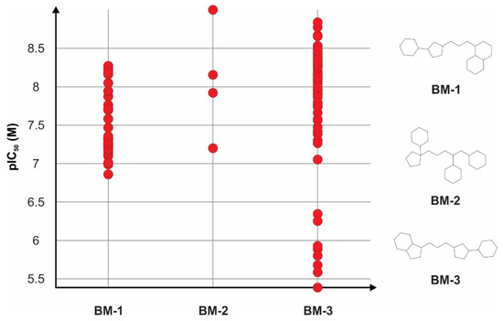 Bemis-Murcko skeletons correlated with significantly higher activity values are shown in Figure 2. Structural skeletons BM-1 (1-[3-(3-cyclohexylcyclopentyl)propyl]-decahydronaphthalene) and BM-3 (1-[3-(3-cyclohexylcyclopentyl)propyl]-octahydro-1H-indene) were highly similar, well represented among the inhibitors with comparable mean pIC50 values, and had several common structural features: a condensed bicyclic structure represented by either nine or ten atoms rings, a three-atom linker, and a pentacyclic substructure linked to a six-atom ring. Structural skeleton BM-2 ([1-(4,5-dicyclohexylpentyl)cyclopentyl]cyclohexane) was less frequent, being specific for only four TRPA1 inhibitors. However, structures containing this specific scaffold had a higher inhibition potency, all compounds showing pIC50 values higher than 7 M.
