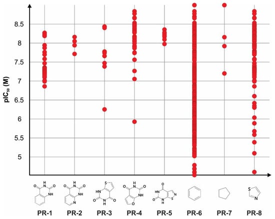 The plain rings systems specific for the TRPA1 inhibitors were split into individual rings in order to analyze their contribution for a high biological activity and are depicted in Figure 3. It was noted that four of the eight total rings were bioisosteres of ring PR-1 (1,2,3,4-tetrahydroquinazoline-2,4-dione), which was contained in structures with pIC50 values ranging between 6.5–8.5 M limits and was specific for Bemis-Murcko skeletons BM-1 and BM-3. Rings PR-2 (1H,2H,3H,4H-pyrido[2,3-d]pyrimidine-2,4-dione) and PR-3 (1H,2H,3H,4H-thieno[2,3-d]pyrimidine-2,4-dione) were less representative, but the replacement of the phenyl aromatic ring with pyridine or thiophene gave higher mean pIC50 values overall. The highest increase in mean activity values could be observed in compounds containing ring PR-5 (4H,5H,6H,7H-[1,2]thiazolo[5,4-d]pyrimidine-4,6-dione), which included a substitution of the phenyl ring with thiazole, while ring PR-4 (1H,2H,3H,4H-furo[2,3-d]pyrimidine-2,4-dione) was found in representants with furan-including rings and pIC50 values higher than 8.5 M (Figure 3).