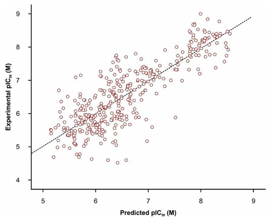 The quantitative biological activity, expressed as the predicted negative logarithmic value of IC50 (pIC50pred) of the repurposing library against the TRPA1 channel, was calculated using MLR methods. Ten stepwise and ten forward equations were built, and one model generated by both methods was chosen based on the model quality parameters. The regression coefficients are presented in Equation (1).