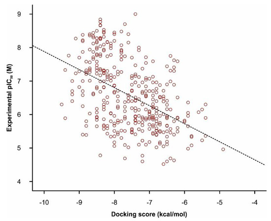 Correlation plot between experimental pIC50 (M) and docking scores (kcal/mol) of TRPA1 antagonists (R2 = 0.226) in molecular docking simulations.