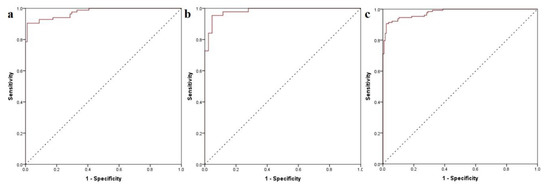 (a) ROC curve of calibration (training) subset; (b) ROC curve of validation (test) subset; (c) global ROC curve of the predictive model.