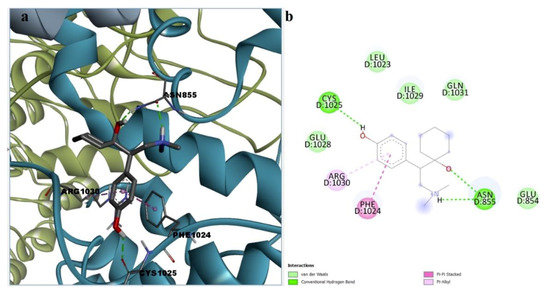 Binding site analysis of the docked poses was performed for desvenlafaxine, paliperidone, and febuxostat in order to estimate possible protein-ligand interactions that could lead to TRPA1 inhibition. The molecular docking algorithm revealed that desvenlafaxine could successfully bind to the A-967079 pocket via weak interactions such as cation-pi and stacked pi-pi interactions with Phe877 and alkyl, alkyl-pi, and van der Waals interactions with surrounding residues (Figure S9). Since no hydrogen bonds were formed, more docking poses were explored. Desvenlafaxine could also interact with HC-030031 putative binding sites, forming two hydrogen bonds with key residue Asn855 via the protonated tertiary amine and the aliphatic hydroxyl and between the aromatic hydroxyl and Cys1025. Moreover, desvenlafaxine participated in stacked pi-pi interaction with Phe1024, alkyl-pi interaction with Arg1030, and hydrophobic van der Waals interactions with five other residues, making it a potential allosteric modulator of the channel activity (Figure 8).
