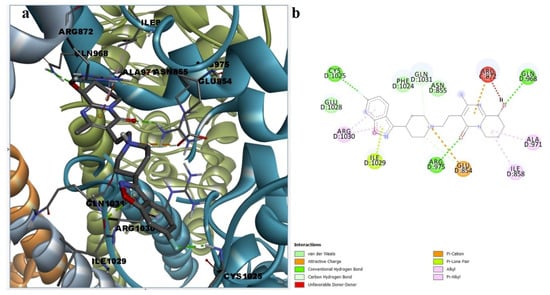 Following receptor structure preparation, the virtual screening was performed for all datasets with rigid residues, and the searching space (grid box) was defined to include both reported adjacent binding sites. Docking scores (binding energies, ΔG, (kcal/mol) corresponding to the first conformation generated for each ligand were retrieved for the screened compounds (TRPA1 inhibitors, decoys, and repositioning candidates). Graphical depictions of ligand poses and interaction diagrams were built using BIOVIA Discovery Studio Visualizer (BIOVIA, Discovery Studio Visualizer, Version 17.2.0, Dassault Systèmes, 2016, San Diego, CA, USA). Validation of the docking experiment was performed by redocking the two positive controls and calculating the squared correlation coefficient (R2) between the experimental pIC50 and the docking scores of the TRPA1 inhibitor dataset.