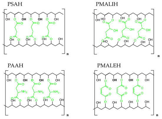 Fourier-Transform Infrared (FT-IR) spectra of PSAH, PAAH, PMALIH and PMALEH were recorded on a Nicolet Nexus 470 spectrometer (Thermo Scientific, Waltham, MA, USA) within the 4000–400 cm−1 spectral intervals. All spectra were obtained in KBr pellets from an average of 32 scans with 4 cm−1 resolution.