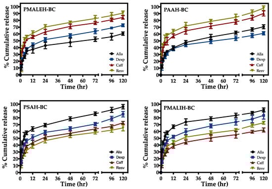 In order to analyze the in vitro release behavior of BC from PDCAH-BC, release profiles were obtained in physiological conditions (33.5 °C, PBS at pH 7.4). The samples were evaluated through HPLC method and the percent of the cumulative amount released was plotted over time. The BC cumulative release profiles are shown in Figure 3; the four PDCAH-BC provided a rapid release into the medium until 6 h, as shown for each BC and hydrogel. For example, 35% of allantoin, 38% of dexpanthenol, 52% of caffeic acid and 56% of resveratrol have been released from PMALEH-BC. After this initial fast release profile, PMALEH-BC showed a slower and steadier BC release into the medium for all cases.