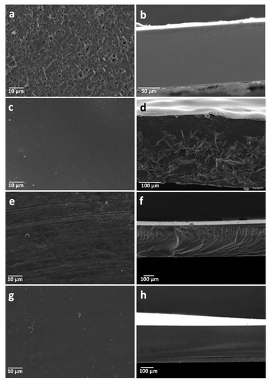 SEM micrographics from the surface and side view of PDCAH. (a–b) PMALEH; (c–d) PAAH; (e–f) PSAH; (g–h) PMALIH.