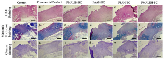 Wound healing is a complex process which is involved of the following overlapping but well-defined stages: hemostasis, inflammation, migration, proliferation and remodeling [55,56]. Hematoxylin and eosin (H&E), Masson’s trichrome and Giemsa staining were utilized to evaluate the wound healing progress. The histology analysis of wounds covered with PDCAH-BC and controls on the 14th postoperative day is shown in Figure 6. In the Control a, the histological analysis shows a limited organization of the area under repair and the absence of reepithelialization was observed. On the other hand, no structural epithelium organization was observed and there was an absence of hair follicle formation. An increase in the cellular content such as fibroblasts, inflammatory and endothelial cells was observed, which is interpreted as a smaller organization of the connective tissue. A lot of blood vessels were observed, showing deep angiogenesis in the repair area. Moreover, moderate hemorrhage composed of extravasated red blood cells towards the deep area of the sample was observed. In addition, some incipient hair follicles at the edges of the healing area were detected (Figure 6a). In contrast, in sample c (PMALIH-BC), stratified epithelium and re-epithelialization in the repair zone was observed. The connective tissue presented a limited organization with high cellularity and vascularization. In sample d (PAAH-BC), the repair zone with a moderated organization and the connective tissue were detected. Moreover, high cellularity and vascularization were observed. In sample e (PSAH-BC), the repair zone with a moderated organization of connective tissue, vascularization and deep cellularity was revelated. The presence of hair follicles was evidenced in the deep area of scarring.
