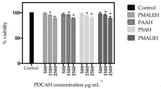 Percentage of cell viability obtained from the MTT assay of the L929 fibroblast cells with respect to a negative control (without PDCAH). n = 3, * = p < 0.05 with respect to the control.