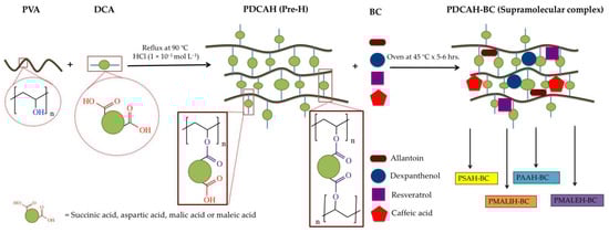 For this study, twenty hydrogels based on PVA and dicarboxylic acids (PDCAH) were proposed. However, according to the theoretical analysis, four candidates present the best interactions with the bioactive compounds (BC) of interest. Therefore, four PDCAH with different crosslinkers were synthesized. The preparations of these platforms were performed through the esterification of PVA with DCA according to the method from Rodríguez Nuñez et al. 2019 with minor modifications [12]. Briefly, the reactions were performed by mixing an aqueous solution of PVA with an aqueous solution of a specific DCA (20 wt %) in presence of 1 × 10−1 mol·L−1 HCl (pH 1). After that, each reaction was carried out under reflux at 90 °C in a necked flask with magnetic agitation. After 3 h, each pre-hydrogel solution was poured into a new flask and a specific amount of BC (allantoin, dexpanthenol, caffeic acid, and resveratrol) was added for it encapsulation, as depicted in Table 1. Then, each solution was homogenized by stirring for 1 h and sonicated for 60 min until a homogenized solution was obtained. After that, each mixture solution was put in an oven at 45 °C overnight until the crosslinking was complete. Then, the PSAH, PAAH, PMALIH and PMALEH with encapsulated BC were washed several times with NaHCO3 for removing the excess acid. Finally, the hydrogels were lyophilized in order to obtain the xerogel. Lastly, each formulation obtained was termed as PSAH-BC, PAAH-BC, PMALIH-BC and PMALEH-BC, respectively.
