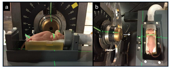 Picture of an anesthetized tumor-bearing mouse positioned on the irradiation platform installed at OPTIS2 at CPT for proton irradiation. (a) Frontal view with beam nozzle in the center of the picture and the inhalation anesthesia on the right side. (b) Top view with the beam nozzle on the left side and the mouse bed on the right side. Direction of beam is indicated by a white arrow.