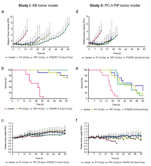 Graphs showing average relative tumor volume of each group until the first mouse of each group had to be euthanized, the median survival and the relative body weight of mice of: Study I (a–c); and Study II (d–f). Control mice (control; pink), mice treated with protons (PT; yellow), mice treated with 177Lu-folate (TRT; blue) and the combination of these modalities (PT and TRT; green). (a,d) Tumor growth curves shown as average of all mice of one group until the first mouse of each group had to be euthanized; (b,e) Kaplan–Meier survival curves; and (c,f) relative body weights.