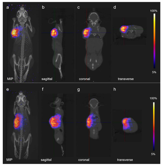 PET/CT images of proton induced activation in mice: (a–d) PET/CT images of a mouse bearing KB tumor xenografts; and (e,f) PET/CT images of a mouse bearing PC-3 PIP tumor xenografts. For both cases, the same proton dose of 20 Gy was delivered to the implanted tumor located on the left side of the mouse: (a,e) maximum intensity projections (MIP); (b,f) sagittal sections; (c,g) coronal sections; and (d,h) transverse sections.