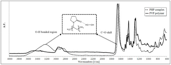 The characteristic vibrational bands of carbonyl and hydroxyl groups of the PHP complex were distinct in the infrared spectrum of the PHP complex from that of PVP alone (Figure 3). The band of carbonyl group shifted to a lower wavenumber (from 1660 cm−1 to 1633 cm−1), indicating the formation of a hydrogen bond with hydrogen peroxide (red shift). The hydroxyl (O–H) region of PVP showed a broad band with the maximum at 3500 cm−1. This is probably originating from residual moisture and from the O–H present at the ends of PVP chains. While in the PHP complex, an additional and distinct peak with maximum at 3100 cm−1 is noticeable, pointing towards the formation of an intermolecular hydrogen bonding between hydrogen peroxide and PVP.