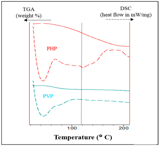 The simultaneously recorded DSC and TGA curves in Figure 4 depict the thermal properties of PHP with respect to the pure PVP. The TGA thermograms showed a clear difference in the weight profiles between PHP and PVP alone which is further supported by the DSC desolvation endotherms. For PVP, two endotherms are notable, the first larger one up to 70 °C and the next between 70–100 °C representing the surface moisture and the bound water content, respectively. In the case of PHP, the first sharp peak corresponds the moisture loss followed by a shallow endotherm of a further loss of moisture. Moreover, a small yet notable endotherm is observed at 150 °C. This is possibly a starting temperature of the peroxide loss (boiling point of free hydrogen peroxide is 150 °C).