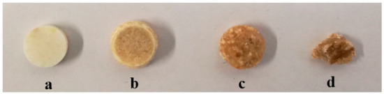 Physical appearance (color) for representative samples of VOR-PHP tablet compacts (a) unexposed (initial); and after storage (b) 1 d (c) 5 d (d) 10 d, at 40 °C/75% RH in open state.