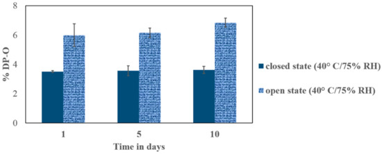 The bar plots representing the percent oxidative degradation in the closed (solid bars) and open (patterned bars) storage at different time intervals. The vertical lines denote the SD for the replicate sample analysis (n = 3).