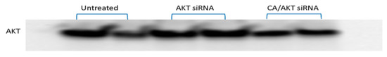 AKT protein expression in MCF-7 cells. Cells were treated with media (untreated), free AKT siRNA, and CA/AKT siRNA formed with 3 mM of CaCl2 and 1 nM siRNA for 44 h. Cellular lysates were resolved by SDS-PAGE and transferred in PVDF membrane followed by incubation with primary antibodies raised in rabbit against AKT. HRP-conjugated goat anti-rabbit secondary antibody was used to detect the chemiluminescent signals.