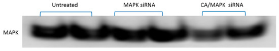 MAPK protein expression in MCF-7 cells. Cells were treated with media (untreated), free MAPK siRNA, and CA/MAPK siRNA formed with 3 mM of CaCl2 and 1 nM siRNA for 44 h. Cellular lysates were resolved by SDS-PAGE and transferred into PVDF membrane followed by incubation with primary antibodies raised in rabbit against AKT. HRP-conjugated goat anti-rabbit secondary antibody was used to detect the chemiluminescent signals.