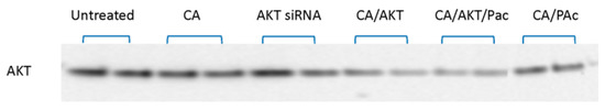 Next, changes in protein expression resulting from the combinations of drugs and siRNAs, as highlighted in the cell viability data, were studied. MCF-7 cell lysate treated with free and CA-bound AKT siRNA, CA/AKT/Pac and CA/Pac were loaded on the gels. According to the resulting bands (Figure 3), the lowest level of AKT protein was obtained by CA/AKT/Pac treatment versus CA/Pac or CA/AKT. This implies the development of synergistic interactions to suppress survival pathways in the presence of classical anti-cancer drugs together with genetic downregulation of survival proteins, which in turn might lead to enhanced sensitivity of the cells to the anti-cancer medication.