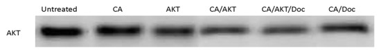 AKT protein expression in MCF-7 cells. Cells were treated with media (untreated), carbonate apatite, free AKT siRNA, CA/AKT siRNA, CA/AKT/Doc, and CA/Doc. Ingredients include 3 mM of CaCl2, 1 nM siRNA, and 1 nM Doc. Cellular lysates were run in SDS-PAGE and transferred into PVDF membrane and incubated with primary antibodies raised in rabbit against AKT. HRP-conjugated goat anti-rabbit secondary antibody was used to detect the chemiluminescent signals.