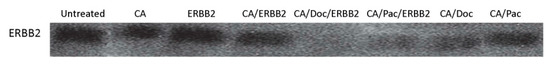 Based on a substantial enhancement in efficacy, the impact of different combinations of ERBB2 siRNA with paclitaxel or docetaxel on the expression level of ERBB2 protein was also examined. As the blot in Figure 5 shows, the highest knock down was achieved by co-delivery of CA-bound Doc and ERBB2 siRNA followed by CA/Pac/ERBB2. Again, the synergy in the therapeutic efficacy of the drug together with siRNA is present since the impact of the drug or siRNA as a single agent is considerably weaker.