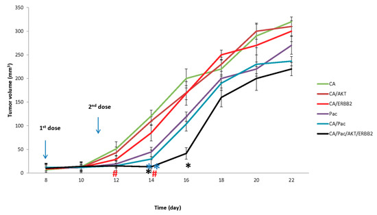 As the t-test results reveal, CA-AKT-ERBB2-Pac treatment significantly reduced the tumor volume on day 14 and 16 compared to Ca/Pac. Moreover, the group treated with CA/ERBB2 displayed significantly smaller tumors compared to the CA group on day 12 and 14. The effect of Pac complexed with CA on tumor regression was significant on day 14 versus free paclitaxel therapy (Figure 6).