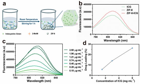 (a) Schematic representations for the in situ fabrication process of indocyanine green (ICG)-loaded zeolitic imidazolate frameworks-8 (ZIF-8) nanoparticles (ZIF-8-ICG); (b) The fluorescent spectrum of ICG, ZIF-8, and ZIF-8-ICG; (c) Fluorescent spectra of ICG solution with different concentrations at the 760 nm excitation wavelength; (d) The ICG-loading capacity of ZIF-8 by optimizing the reactant concentration of ICG.