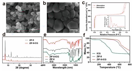 The morphology and particle size of nanoparticles were observed by scanning electron microscopy (SEM). Figure 2a,b revealed that the ZIF-8 and ZIF-8-ICG both appeared as typical hexagon morphology, suggesting that the ICG encapsulation would not change the morphology of ZIF-8. In addition, the particle size of ZIF-8-ICG was a bit larger than that of ZIF-8, which might be attributed to the influence of ICG on the process of nucleation and growth of ZIF-8 [27]. Quantitative information about the structure of porous materials can be usually analyzed by N2 absorption and desorption measurement. As shown in Figure 2c, the BET surface area and pore size of ZIF-8 were calculated as 1836.4 cm2·g−1 and 0.8 nm, respectively. The extremely large surface area and porous interiors contributed to encapsulate large amount of ICG molecules into the pores of ZIF-8 and subsequently stabilize the photothermal agent by the spatial confinement effect. The crystallographic structure of ZIF-8-ICG was characterized by powder X-ray diffraction (PXRD). Figure 2d revealed that the ZIF-8-ICG exhibited similar crystalline characteristic peaks to ZIF-8, which demonstrated that the encapsulation of ICG did not damage the natural crystalline structure of ZIF-8. Additionally, the chemical structure of all samples was investigated by Fourier transform infrared spectroscopy (FT-IR). As shown in Figure 2e, the characteristic peaks of ZIF-8 including C–H stretch, aliphatic C–H stretch of the imidazole, and Z–N stretching mode were in good agreement with the published literatures [28,29]. The spectrum of ZIF-8-ICG was mostly similar to that of ZIF-8 with no characteristic bonds of ICG observed, revealing that the encapsulation of ICG mainly resulted from physical absorption. The thermal gravimetric analysis (TGA) result of ZIF-8 and ZIF-8-ICG was exhibited in Figure 2f. Both ZIF-8 and ZIF-8-ICG kept stable even the temperature increased to 400 °C. By contrast, free ICG showed an obvious mass decline at 100 °C which was ascribed to the free water evaporation, followed by a continuous mass decline when the temperature was over 200 °C. These results indicated that the encapsulation of ICG into the pores of ZIF-8 was beneficial to improving the thermal stability of ICG.