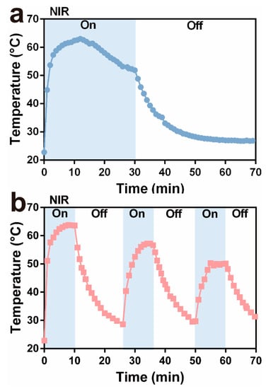 Change in thermal curves of ZIF-8-ICG suspensions after (a) one time irradiation and (b) three times irradiation for 30 min.
