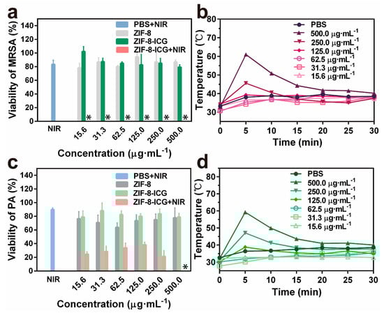 To investigate the in vitro chemo-photothermal effect of ZIF-8-ICG, bacteria were cultured with different samples and further irradiated with a laser, using standard agar plate method to evaluate the viability of bacteria. MRSA and P. aeruginosa were selected as the representative strains of Gram-positive bacteria and Gram-negative bacteria, respectively. As shown in Figure 4a, ZIF-8-ICG+NIR treated group achieved ~100% MRSA killing efficiencies at a broad concentration range of 15.6~500.0 µg·mL−1, while PBS+NIR, ZIF-8, and ZIF-8-ICG treated groups showed no significant influence on the viability of MRSA (Figure 4a). Similarly, the percentage of P. aeruginosa survival in ZIF-8-ICG+NIR treated group was lower than 40% (Figure 4c), indicating the efficient bactericidal effect of photothermal therapy. The viabilities of bacteria in logarithmic indication were presented in Figure A1. It should be mentioned that when the concentration of ZIF-8-ICG in bacterial suspension was lower than 250.0 µg·mL−1, NIR laser irradiation could not result in great temperature increase (lower than 50 °C), as shown in Figure 4b,d. The outstanding photothermal bactericidal activity of ZIF-8-ICG+NIR treated group at low temperature demonstrated the importance of combining photothermal therapy with chemotherapy, because Zn2+ ions released from ZIF-8 increased the permeability of bacterial cell membrane and reduced the heat resistance of bacteria.