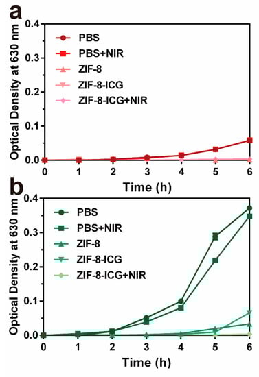 Furthermore, the bacterial growth kinetics were investigated by incubating different nanoparticles with MRSA and P. aeruginosa at 37 °C, followed by measuring the optical density at predetermined time intervals. As shown in Figure 5a,b, while laser irradiation had negligible influence on inhibiting the growth of MRSA and P. aeruginosa, the optical densities increases of both ZIF-8 and ZIF-8-ICG treated groups were obviously restrained. The results indicated the unique advantage of ZIF-8 as a carrier for antimicrobial application. Since the pH of bacterial infected microenvironment is usually lower than 6.5, abundant Zn2+ ions can be released from both ZIF-8 and ZIF-8-ICG showing chemotherapeutic effect on inhibiting bacterial growth. Moreover, complete growth inhibition of MRSA and P. aeruginosa was observed in the group of ZIF-8-ICG with NIR laser irradiation, which further illustrated the great bactericidal efficacy of photothermal therapy.