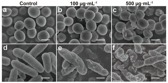 To further understand the mechanism of the antimicrobial functions of the ZIF-8-ICG with NIR laser irradiation, we investigated the morphological changes of bacteria before and after treatment through SEM. As shown in Figure 6a,d, smooth surface was observed in both untreated MRSA and P. aeruginosa group. After incubation with ZIF-8-ICG under laser irradiation for 30 min, both MRSA and P. aeruginosa cell surface become rougher and more wrinkled with concave holes as the concentration of ZIF-8-ICG was increased (Figure 6b,c,e,f). Obviously distorted cell shape and leakages of cytoplasmic contents could be observed, when cells were treated with ZIF-8-ICG at a concentration higher than 500 µg·mL−1. The results illuminated the significant influence of photothermal ablation on disrupting bacterial morphology.