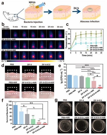 (a) Schematic illustration of the mice modeling process by local injection; (b) The thermographic images of MRSA-infected mice under 808 nm laser irradiation at 0, 5, 10, 15, 20, 25, and 30 min post-administration; (c) Local temperature profiles of laser treated mice at different time points; (d) Digital photographs of the infected skin surface after different treatments; (e) Microbial burden after different treatments in murine models of skin; (f) Bacterial viability of MRSA after different treatments. * p < 0.05 vs. PBS; *** p < 0.001 vs. PBS; & p < 0.05 vs. PBS+NIR; && p < 0.01 vs. PBS+NIR; &&& p < 0.001 vs. PBS+NIR; % p < 0.05 vs. ZIF-8; %% p < 0.01 vs. ZIF-8; %%% p < 0.001 vs. ZIF-8; # p < 0.05 vs. ZIF-8-ICG; ### p < 0.001 vs. ZIF-8-ICG; @ p < 0.05 vs. ZIF-8-ICG-L+NIR; (g) Photographs of MRSA colonies in the agar plates.
