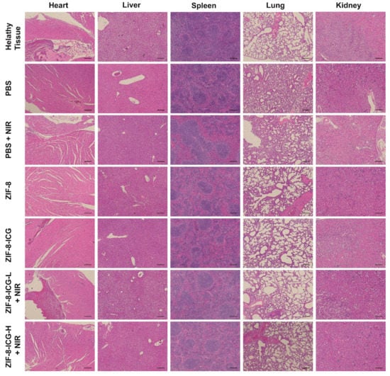 Hematoxylin and eosin-stained images of major organ sections after treatments with PBS, PBS+NIR, ZIF-8, ZIF-8-ICG, ZIF-8-ICG-L+NIR, and ZIF-8-ICG-H+NIR (Scale bar: 50 µm).