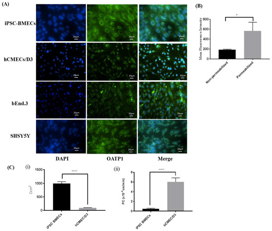 (A) Immunocytochemistry indicates positive expression of organic anion transporting polypeptide (OATP)1 in three different brain endothelial cells; two human (induced pluripotent stem cells differentiated brain microvascular endothelial cells (iPSC-BMECs) and hCMEC/D3) and one mouse (bEnd.3). SHSY5Y cells were used as positive control. The image clearly shows that there are both perinuclear (predominant) and membranous expression of OATP1 in iPSC-MBECs. Beside human cell lines, bEnd.3 also expresses this transporter, however comparatively lower than iPSC-BMEC and hCMEC/D3 cells. (B) The expression of membrane OATP1 was confirmed while using flow cytometry. Mean fluorescence intensity (MFI) was measured using permeabilized and non-permeabilized cells. Flow cytometry analysis data confirm the expression of OATP1 in iPSC-BMECs on membrane as well as in perinuclear region (C) Barrier function of the cells was measured using transendothelial electrical resistance (TEER) (C-i) and [14C] sucrose permeability (C-ii) across cells monolayer. The iPSC-BMECs exhibit restrictive barrier properties as compared to hCMEC/D3 demonstrated by ten times higher TEER and ten times lower paracellular permeability. Data represented as Mean ± SD (n = 5). * p < 0.05, **** p < 0.0001.