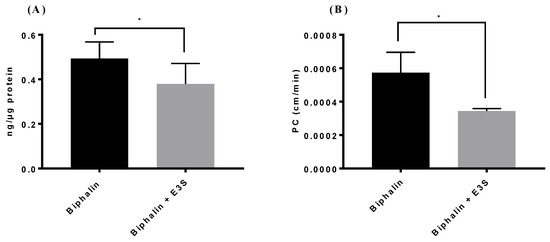 Barrier integrity or monolayer tightness was assessed by measuring transendothelial electrical resistance (TEER) while using a Millicell ERS electrode (Millipore, Bedford, MA, USA). Paracellular permeability was assessed in monolayers by measuring the diffusion profile of 0.1 µCi of [14C] sucrose (PerkinElmer, Waltham, MA, USA). Radioactivities of samples were counted using a liquid scintillation counter (PerkinElmer, Waltham, MA, USA). The permeability coefficient was calculated while using following formula [34]: