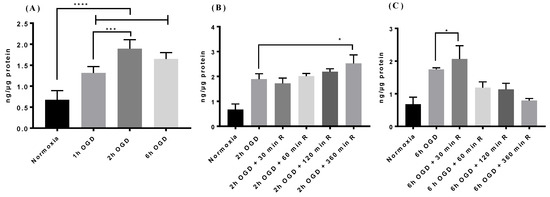 We observed that biphalin uptake significantly increased after 1 h (1.9-fold), 2 h (2.8 fold), and 6 h (2.4 fold) of OGD exposure as compared to the uptake in normoxic conditions (p < 0.0001) (Figure 3A). Interestingly, 2 h OGD exposure resulted in significantly higher uptake when compared to 1 h OGD (1.89 ± 0.015 ng/ug vs 1.31 ± 0.2 ng/ug) and no significant difference was observed between 2 h and 6 h OGD exposure (1.89 ± 0.015 ng/ug vs 1.64 ± 0.15 ng/ug).