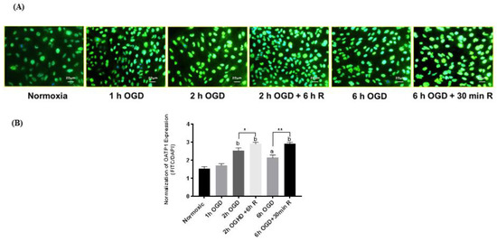(A) Immunofluorescence images of iPSC-BMECs after staining with OATP1 antibody at different OGD)-reperfusion time points. (B) Quantitative measurement of the changes in OATP1 expression after normalizing mean fluorescence intensity of OATP1 with that of 4,6-diamidino-2-phenylindole (DAPI). The expression of OATP1 in iPSC-BMECs increased after 2 and 6 h OGD exposure which further increased during reperfusion. Data represented as Mean ± SD (n = 4). * p < 0.05, ** p < 0.01. a < 0.001, b < 0.0001 vs normoxic.