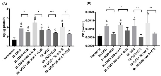 Biphalin uptake into iPSC-BMECs and transport across iPSC-BMEC monolayers was measured in the presence and absence of OATP1 substrate, E3S. We selected four time points for uptake (Figure 5A) and transport studies (Figure 5B) based on the results of uptake studies and immunofluorescence assay, which were 2 and 6 h OGD exposure and 6 h reperfusion after 2 h OGD and 30 min. reperfusion after 6 h OGD. The cells were incubated with E3S (10 min. for uptake studies, whereas 30 min. for transport studies) before incubating them with biphalin. We found that biphalin uptake significantly decreased (p < 0.05) in the presence of E3S in comparison to the corresponding time points without E3S pre-incubation (Figure 5A). Similar results were observed in the transport studies (Figure 5B), where biphalin transport across the monolayer increased after 2 and 6 h OGD exposure, but significantly decreased in the presence of OATP1 substrate E3S.