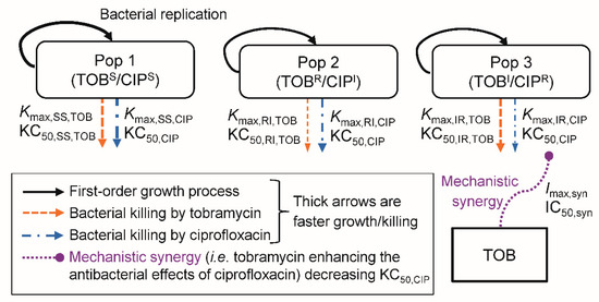 We evaluated subpopulation synergy (i.e., tobramycin killing the bacteria resistant to ciprofloxacin and vice versa) and mechanistic synergy (i.e., tobramycin enhancing the bacterial killing by ciprofloxacin) [21,25,26,27]. The mechanistic synergy equation was: