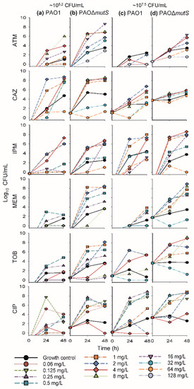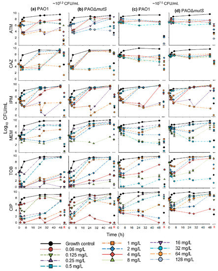 The log10 viability counts (CFU/mL) of bacterial growth on antibiotic-free agar plates (total populations) versus time for non-hypermutable PAO1 and hypermutable PAO∆mutS exposed to aztreonam (ATM), ceftazidime (CAZ), imipenem (IPM), meropenem (MEM), tobramycin (TOB), and ciprofloxacin (CIP) in 48-h static concentration time-kill experiments at two initial inocula (lower ~105.2 CFU/mL on the left, (a) PAO1, (b) PAO∆mutS,and higher ~107.5 CFU/mL on the right, (c) PAO1, (d) PAO∆mutS). The following concentrations were studied against both inocula of each strain (unless denoted otherwise): aztreonam 1a, 2, 4, 8b, 16, 32c,d, 64a,d, and 128c,d mg/L; ceftazidime 1, 2, 4, 8, 32, and 64 mg/L; imipenem 0.5, 1, 2, 4, 16, and 64 mg/L; meropenem 0.25, 0.5, 1, 2, 8, and 32d mg/L; tobramycin 0.25b, 0.5b, 1, 2, 4, 8, 16b, and 32d mg/L; and ciprofloxacin 0.0625b, 0.125, 0.25, 0.5, 1, 2d, and 4 mg/L. The biological replicate studies for meropenem (8 mg/L), tobramycin (8 mg/L), and ciprofloxacin (1 mg/L) revealed significant differences (p < 0.001, p < 0.01 and p < 0.001, respectively) between the two strains in the bacterial density at 48 h; see also Figure S1. R: denotes the bacterial population that grew on antibiotic-containing agar plates at 48 h. a Concentration was only used against the lower inoculum (105.2 CFU/mL) of PAO1. b Concentration was only used against the lower inoculum (105.2 CFU/mL) of both strains. c Concentration was only used against the lower inoculum (105.2 CFU/mL) of PAO∆mutS. d Concentration was only used against the higher inoculum (107.5 CFU/mL) of both strains.