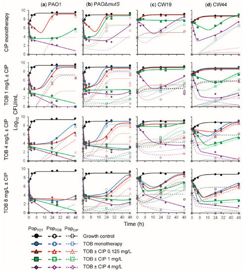 The log10 viability counts (CFU/mL) of bacterial growth versus time for (a) non-hypermutable PAO1, (b) hypermutable PAO∆mutS, (c) CW19, and (d) CW44 exposed to tobramycin (TOB) and ciprofloxacin (CIP) alone and combined in 48-h static concentration time-kill experiments at an inoculum of ~107.5 CFU/mL. The top-tier panels show the growth control and ciprofloxacin monotherapies, the second-tier panels show the 1 mg/L tobramycin in monotherapy and combinations with ciprofloxacin, the third-tier panels show the 4 mg/L tobramycin in monotherapy and combinations with ciprofloxacin, and the fourth-tier panels show the 8 mg/L tobramycin in monotherapy and combinations with ciprofloxacin. The solid lines and symbols represent the total population (PopTOT) on drug-free agar plates and the hollow symbols with dashed and dotted lines are the tobramycin- (PopTOB) and ciprofloxacin-less susceptible (PopCIP) populations, respectively. All lines are mechanism-based model fits.