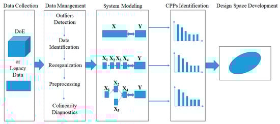 As displayed in Figure 2, a systematic procedure to establish a design space that spans multi-unit operation processes in a line includes the following activities: (1) data collection; (2) data preprocessing; (3) system modeling; (4) CPPs identification; and (5) design space development.