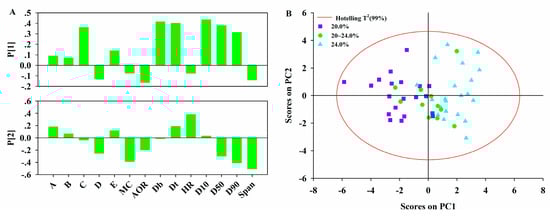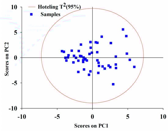 In Equations (1)–(3), W is the weight of matrix X, T represents the scores of matrix X, P and Q stand for the loadings of matrix X and Y, respectively. E and F are the residuals of matrix X and Y, respectively.