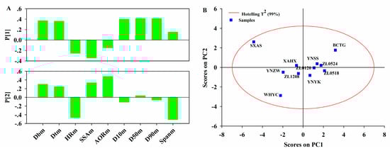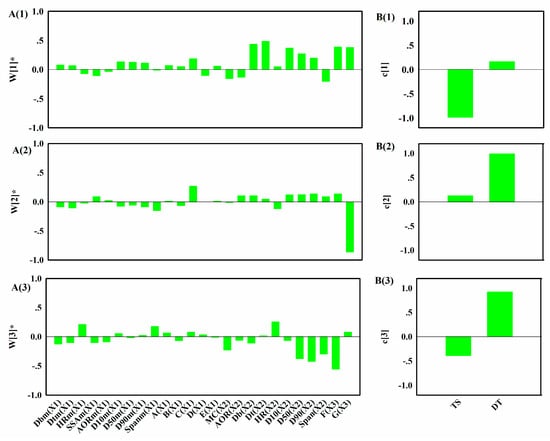 To understand how the variables in different blocks related and interacted, the loadings of the MBPLSPM model were analyzed. The bar plots of weights W* of matrix [X1, X2, X3], weighted on the variables are showed in Figure 9A. The bar plots of loadings Q of Y, which indicated the contribution of each variable in LVs are reported in Figure 9B.
